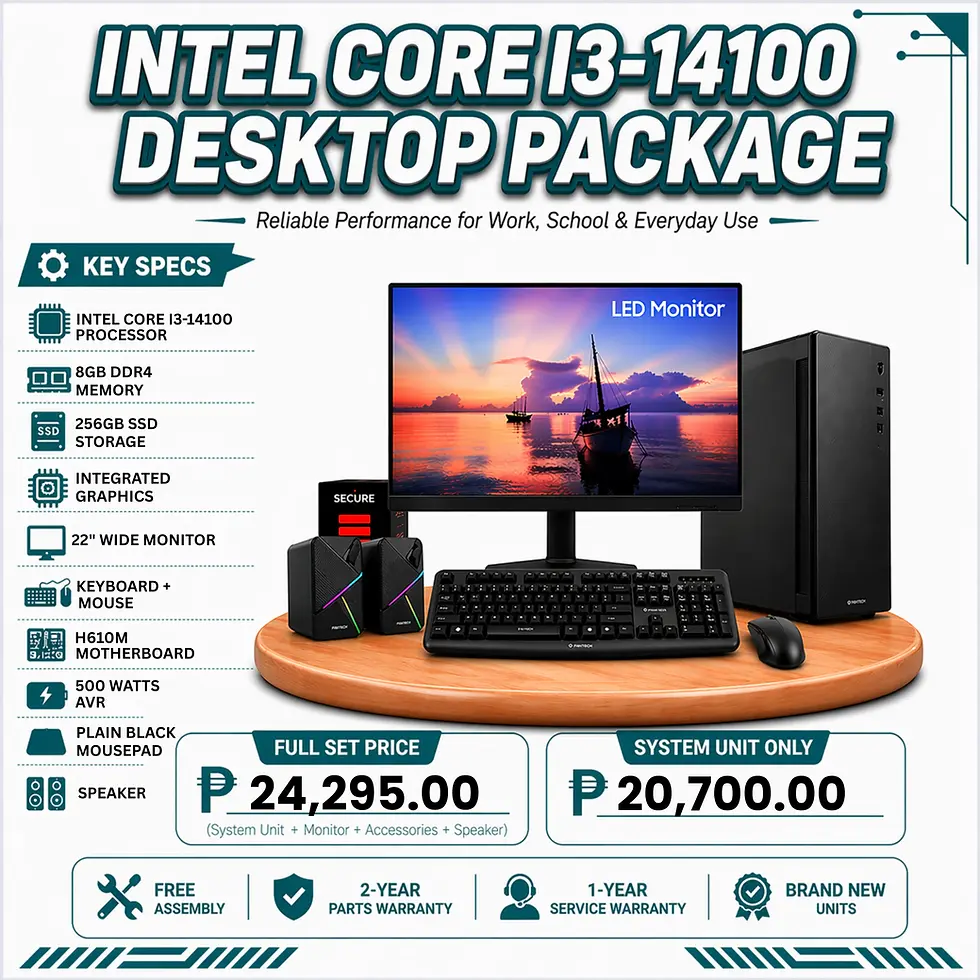 The Intel Core i3-14100 Desktop Package is a complete and budget-friendly solution designed for students, office work, and home use. Powered by the latest Intel 14th Gen processor, it delivers smooth performance for everyday computing.This package includes a monitor, keyboard, mouse, and speakers, making it a ready-to-use full setup right out of the box.